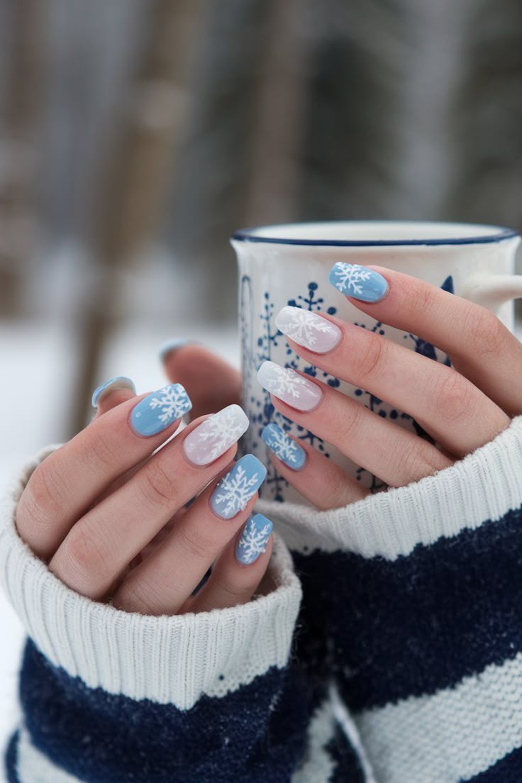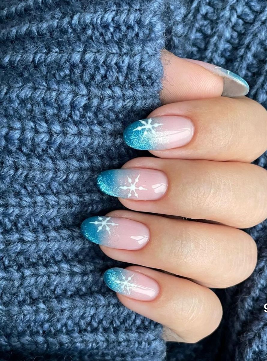These nails feel like stepping straight into a snow globe. The soft ice blue gradient tips fade into a pale pink base, finished with delicate white snowflakes. The almond shape adds to the elegant feel, making them perfect for both casual winter wear and classy events. It’s a timeless seasonal look that feels both magical and wearable.