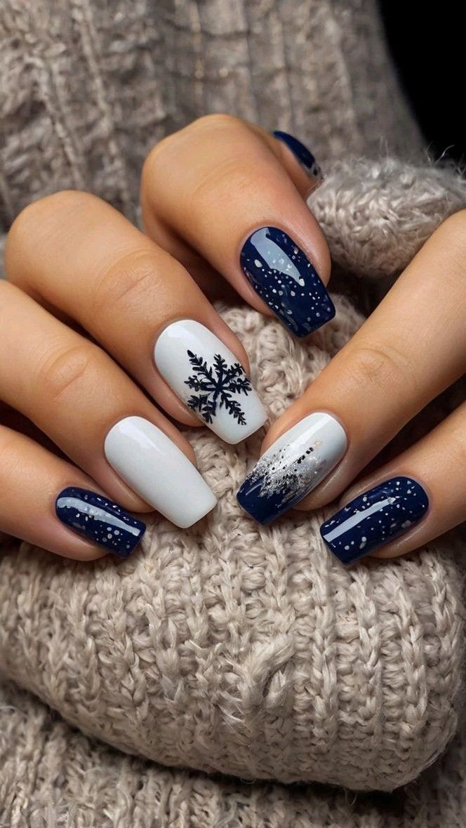 This set is perfect for anyone who loves strong contrast. The square shape gives structure, while the dark navy base contrasts against crisp white nails decorated with snowflakes and shimmering streaks. The designs feel like a starry winter night—bold, dramatic, and unforgettable. This one works beautifully for evening events or even as a bold everyday look if you’re into trend-forward styling.