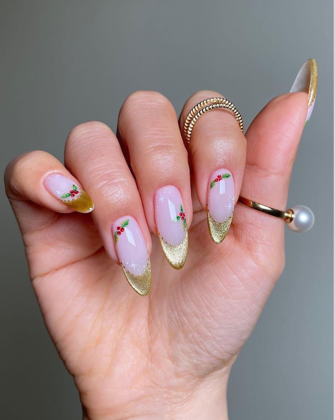 Nothing says festive like gold glitter French tips paired with delicate holly berry details. These nails radiate holiday spirit while staying on the side of classy and wearable. Perfect for December gatherings, office parties, or even Christmas dinners, they add sparkle without overwhelming. They might not feel right for someone who prefers a minimalist approach, but if you love festive cheer, they’re irresistible.