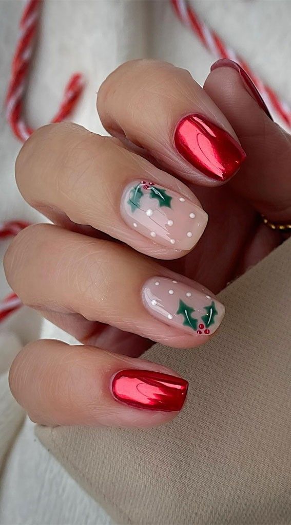 This set embraces holiday joy with glossy red metallic polish and holly leaf accents. It’s a cute, spirited choice for Christmas gatherings, though maybe too bold for understated dress codes. The balance between gel shine and playful nail art keeps it trendy yet fun.