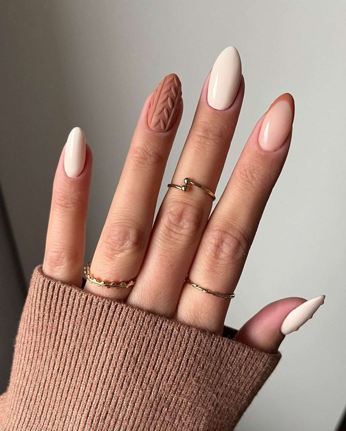 This cozy look combines warm beige and ivory tones with one nail featuring a knitted sweater texture. It’s simple, classy, and perfect for anyone who loves tactile winter details. The almond shape adds femininity, while the mix of glossy and textured finishes makes it both fashionable and wearable.