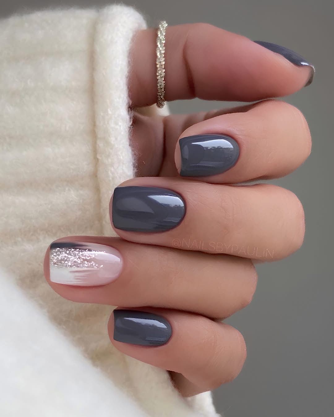 This style balances practicality with quiet sophistication. The short length makes it perfect for everyday wear, especially if you’re someone who types a lot or prefers an easy, low-maintenance manicure. The muted dark grey color feels classy and season-appropriate, while the single accent nail with a shimmer detail adds just enough sparkle to avoid monotony. This look is versatile—you could wear it to the office, casual dinners, or even formal events. It may not be the best choice if you love bold, festive holiday patterns, but it’s perfect for anyone leaning into simple winter chic.