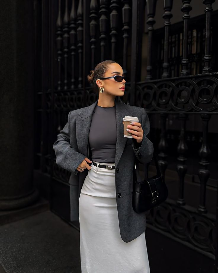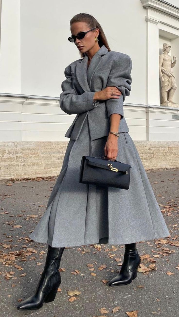 A gray ensemble can be the epitome of elegance and sophistication, especially when crafted with meticulous detail and exquisite tailoring. This outfit showcases a structured gray blazer paired with a matching gray maxi skirt, creating a harmonious and polished look perfect for fall.