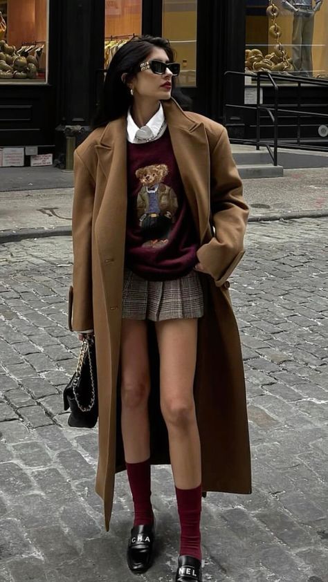 This preppy look features a short pleated skirt paired with a cozy cardigan, perfect for those crisp fall days. It’s an outfit that exudes youthful charm and elegance.