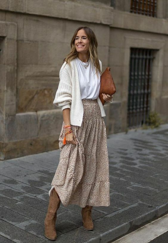 For a more relaxed, bohemian vibe, this outfit is a perfect choice. The long, flowy skirt paired with a simple white tee and cardigan creates a look that is both comfortable and stylish.