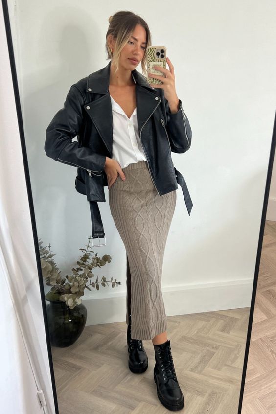 Knits are a fall staple, offering both warmth and style. This outfit features a knit skirt paired with a leather jacket, blending comfort with a touch of edginess.
