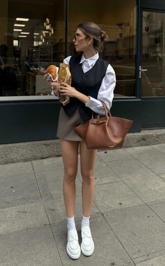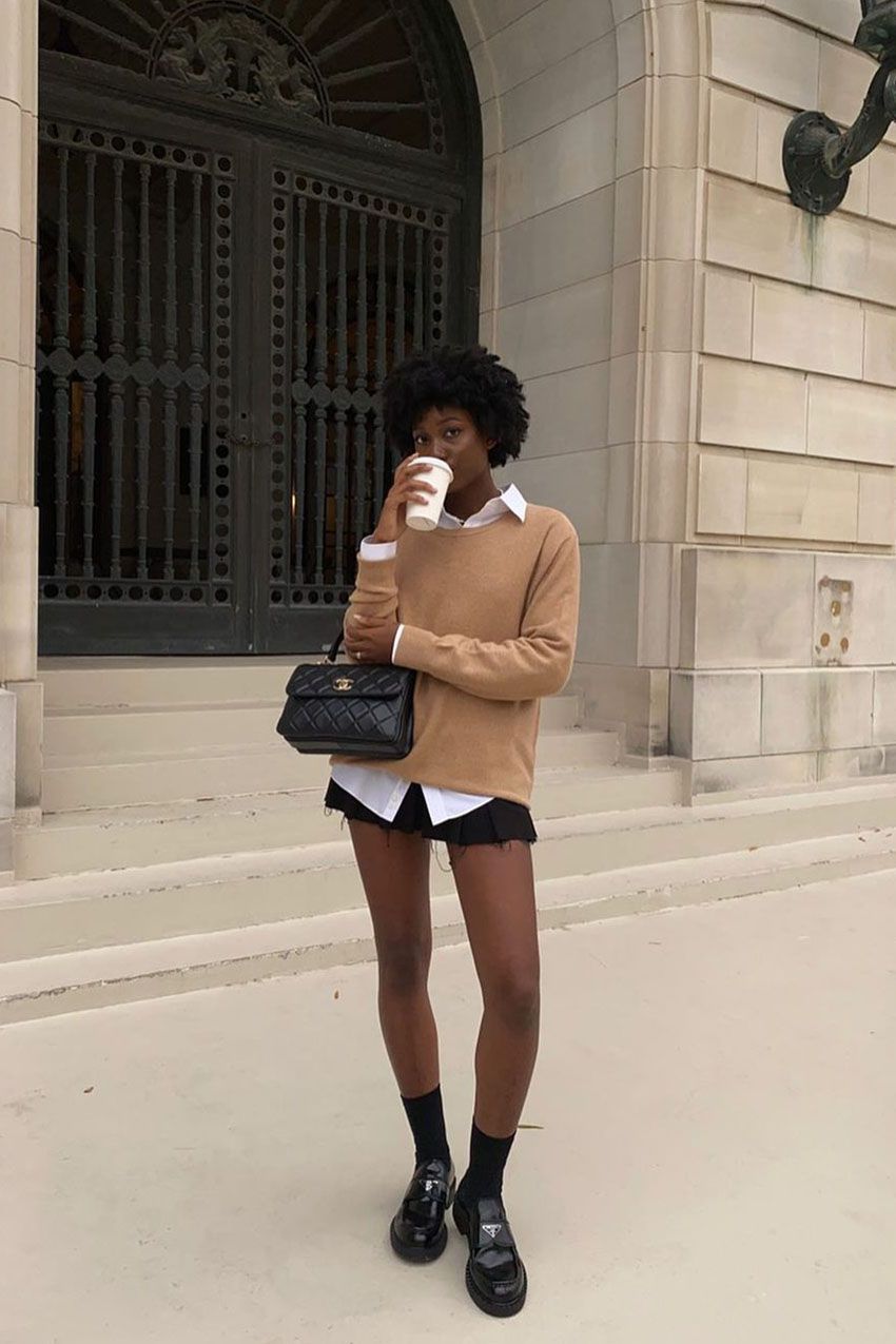 Minimalist with a bit of a bite. This look pairs a camel crewneck with a crisp white shirt and micro black skirt for a sleek blend of casual and clever. Black Prada loafers and socks pull everything together with a subtle wink. It suits smaller frames best due to the short hemline and narrow top. A top pick for those who want a little attitude without over-accessorizing.