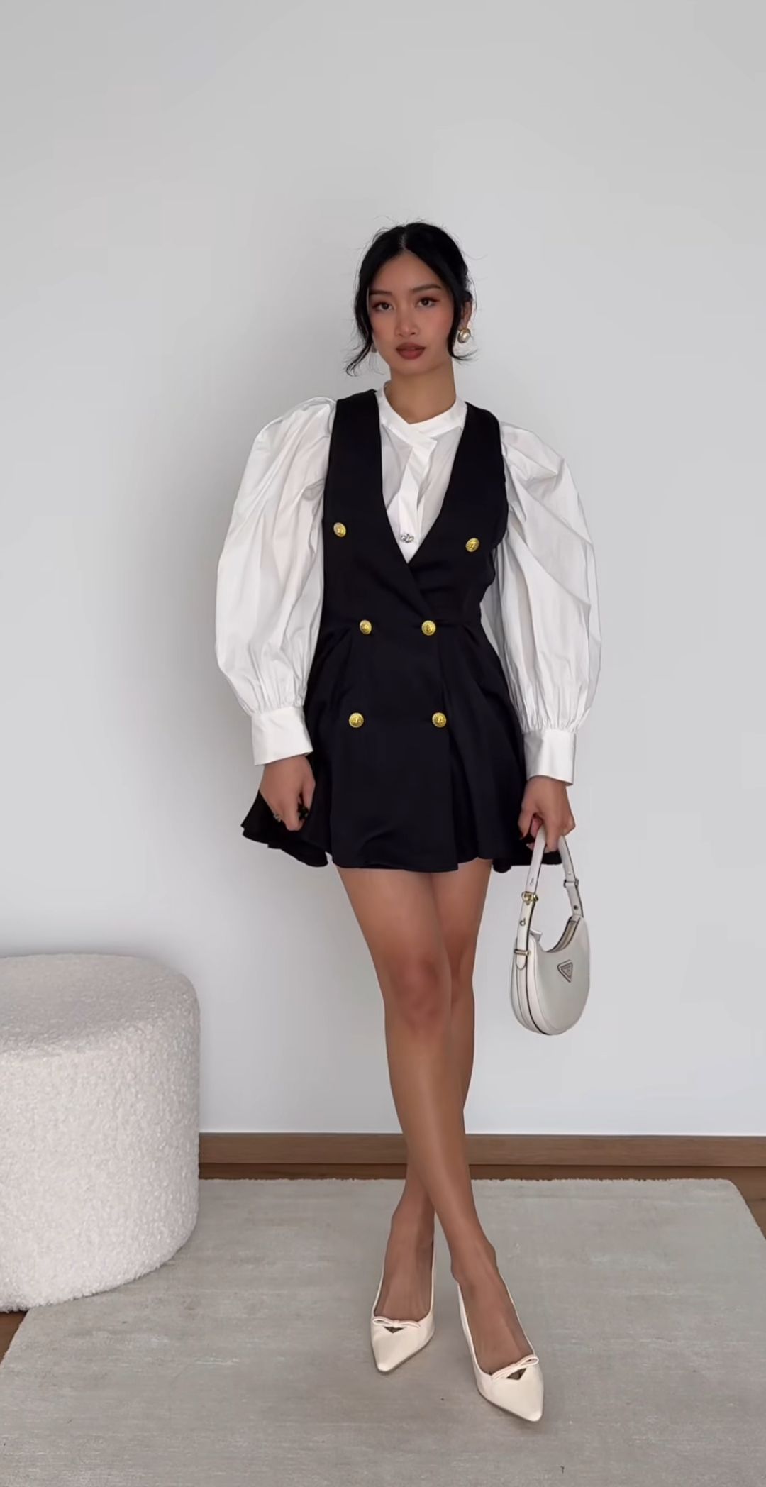 For the bold fashion lovers who treat Monday like Fashion Week, this look is a showstopper. A structured black pinafore-style mini dress layered over a balloon-sleeved white shirt is giving vintage couture with academic edge. Best for tall or slim builds due to the volume up top and cinched waist. It’s not exactly a Freshman uniform, but it’s a statement piece for drama class, school plays, or yearbook photos.
