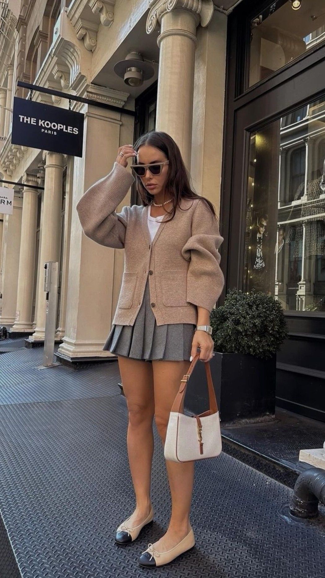 I’d skip any oversized accessories here—this look thrives on streamlined elegance. A thin headband or dainty necklace would add a personal touch without disrupting the tonal perfection. Definitely avoid clashing prints—this outfit is about neutral confidence, not chaos.