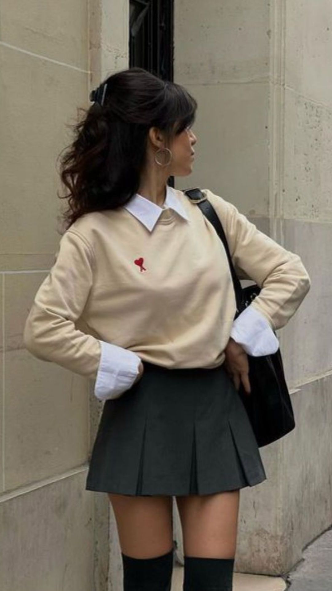 This outfit is for the no-nonsense girl who still slays. A black sweater layered over a crisp white shirt with a tan pleated skirt is the kind of cool that doesn’t raise its voice. It fits well into stricter dress codes and easily transitions from class to café. Ideal for those who prefer a modest and elegant silhouette. Works well for all body types thanks to the classic, waist-accentuating lines.
