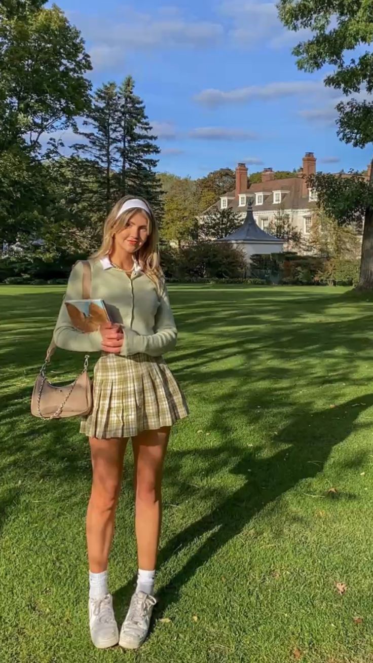 A collage postcard brought to life. This plaid pleated skirt, white-collared top, and sage green cardigan combo is basically Clueless meets softcore prep. It’s perfect for early fall days on campus greens, school events, or class photos. Great for lean or athletic builds—the mini length elongates legs and keeps things light.