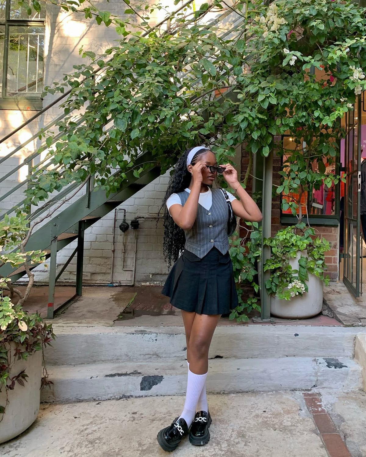 There’s something rebellious yet undeniably modest about this combo. A fitted pinstripe vest layered over a white tee brings retro student council chic, and the dark pleated skirt says you’re here to ace every class—on your own terms. The white knee socks and chunky loafers give it a nod to Y2k styling without trying too hard. Great for slim or rectangular builds, this look is casual enough for campus but elevated enough for after-school outings.