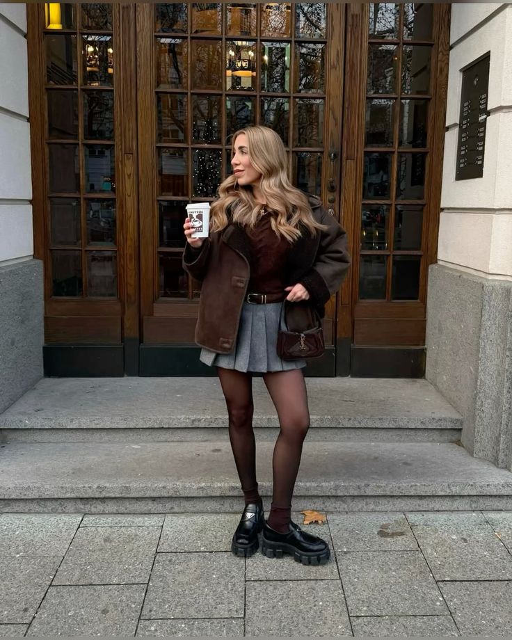 This look is all about 2025 fall energy. The chocolate-brown faux fur pullover layered under a structured leather-trim jacket adds texture and richness, while the gray pleated skirt keeps things grounded. It’s an ideal fit for students who thrive in colder climates or love layering. Curvier and hourglass figures will find balance in the cropped jacket silhouette and defined waist. A perfect mix of collage chic and classic cold-weather prep.