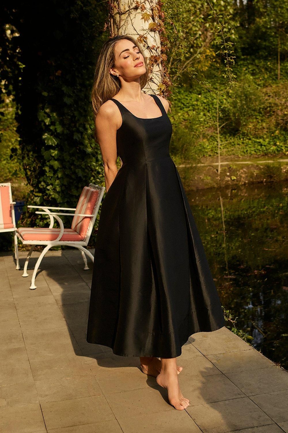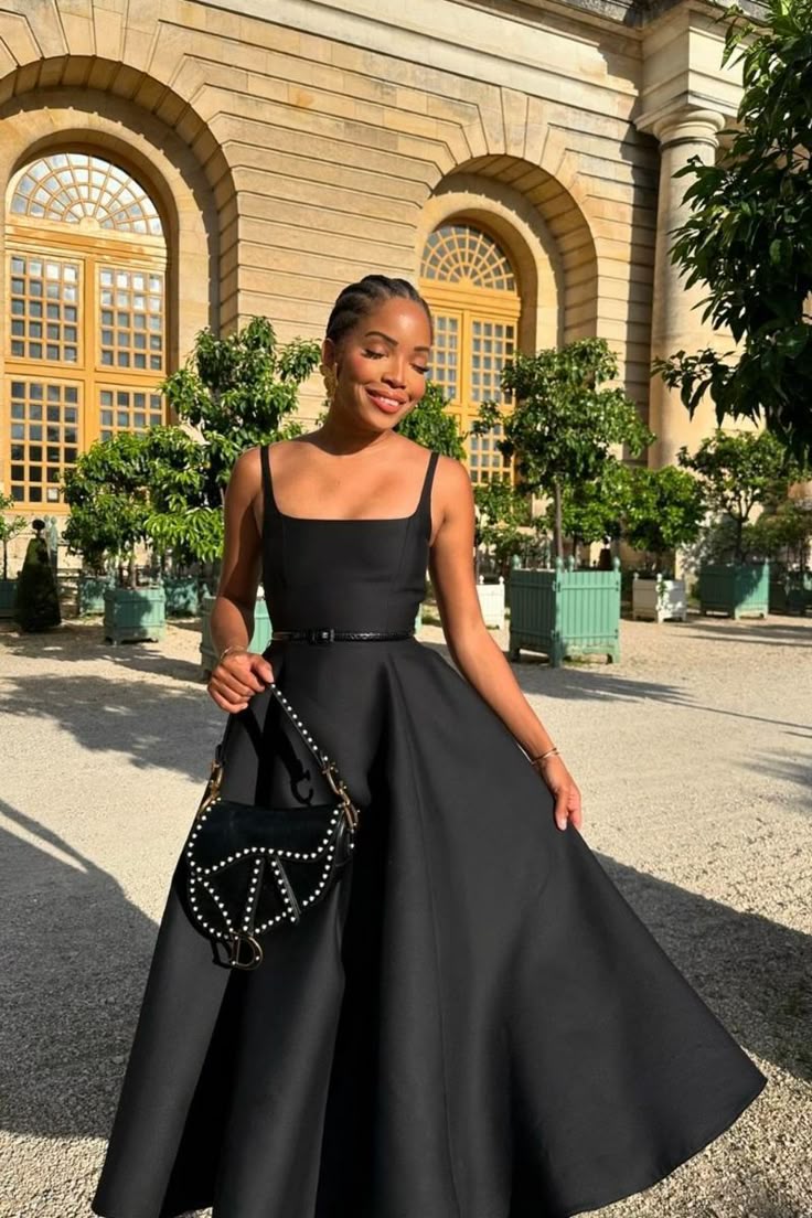 Here, the black A-line dress in smooth satin delivers a simple, sunlit interpretation of the classic midi silhouette. The square neckline and wide straps make it accessible for many body shapes, especially pear and hourglass figures thanks to the structured bodice and easy flared skirt. This dress thrives in summer garden events, brunches, or outdoor celebrations, but would feel too airy for nighttime winter formality or party indian celebrations where embellishment is preferred.