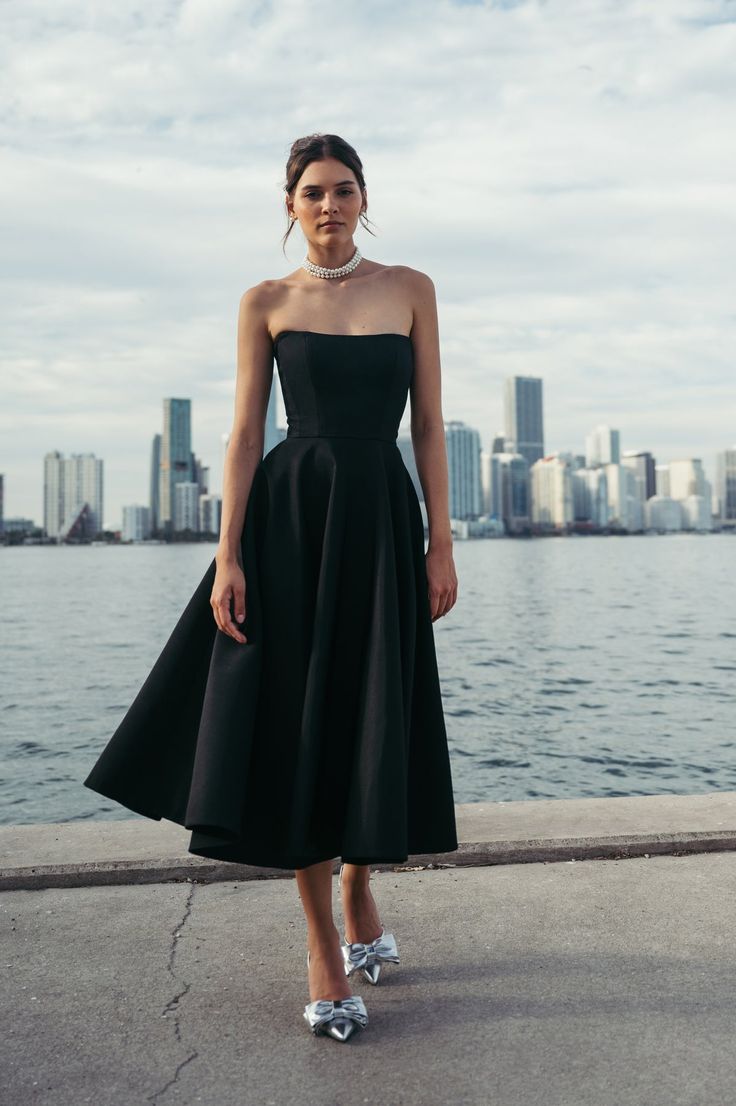 This strapless, full-skirted midi dress represents the kind of classy elegant style that carries beautifully from sunset dinners to waterfront parties. The clean bodice and generous skirt make it fantastic for women who enjoy defined waists and structured silhouettes. It leans formal without being overly demanding, making it equally appropriate for summer soirées or transitional weather with a tailored shawl.