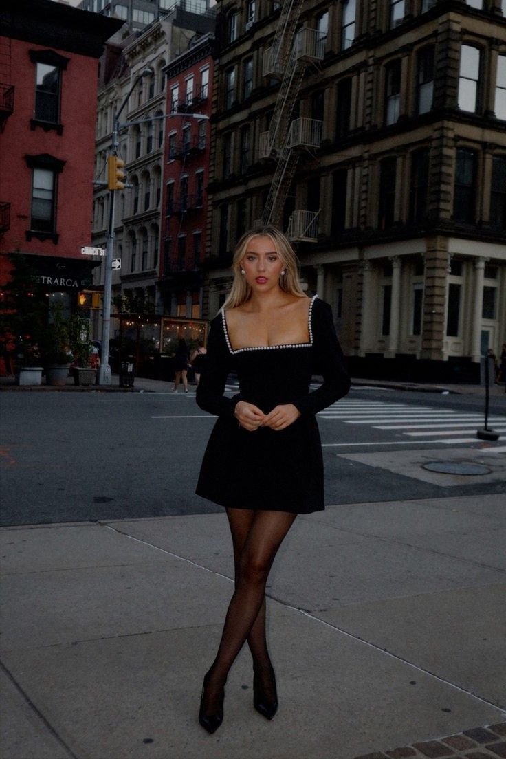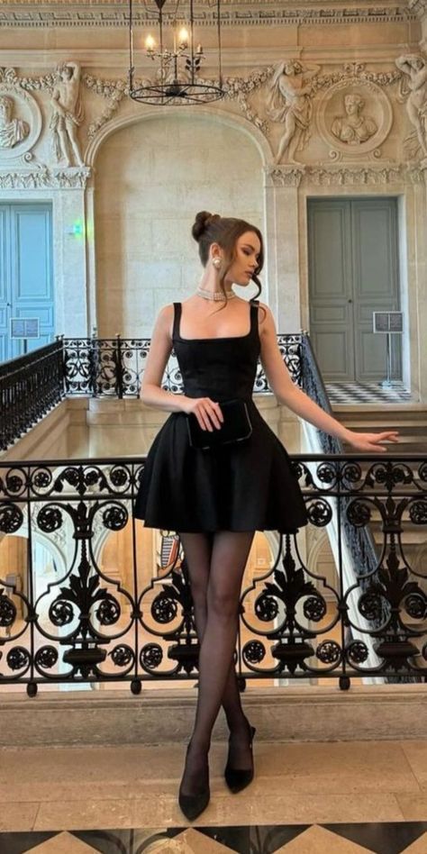 This short A-line dress channels pure classy elegant charm with a Parisian twist. The square neckline, sculpted bodice, and flared mini skirt make it ideal for petite and balanced-height figures. The sheer black tights and pointed pumps build a refined, museum-worthy presence—perfect for fashion exhibitions, upscale dinners, and winter-transitional outings. This is not ideal for extremely formal occasions requiring classy elegant formal long attire, but exceptional for everything leading up to it.