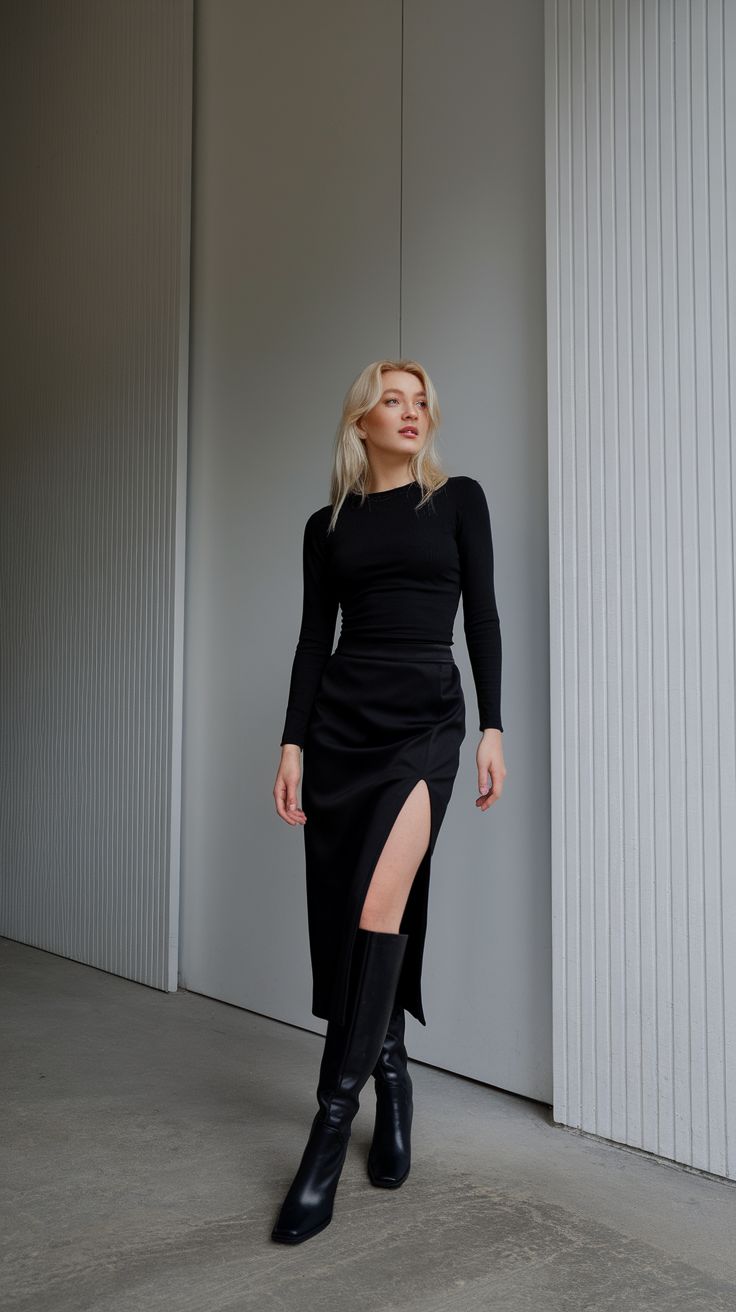 There’s something undeniably magnetic about simplicity done right. A fitted black long-sleeve top paired with a satin high-slit midi skirt hits the perfect blend of minimalism and seduction. This look adapts wonderfully to both summer evenings and cooler nights with the right layering. It flatters rectangle, athletic, and slim hourglass figures especially well—the vertical slit adds movement and elongation, while the fitted top creates sleek definition.