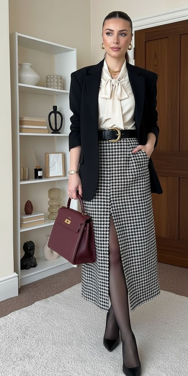 This look leans into timeless elegance: a silk bow blouse, a structured black blazer, and a houndstooth midi skirt with a center slit. It’s ideal for women of various ages — including women over 50 — because the silhouette lengthens the figure while staying modest and polished. Perfect for winter, autumn, formal work environments, or women at networking events where you need to appear refined without sacrificing personality. The slit adds mobility, making the outfit practical for long office hours or city commuting.