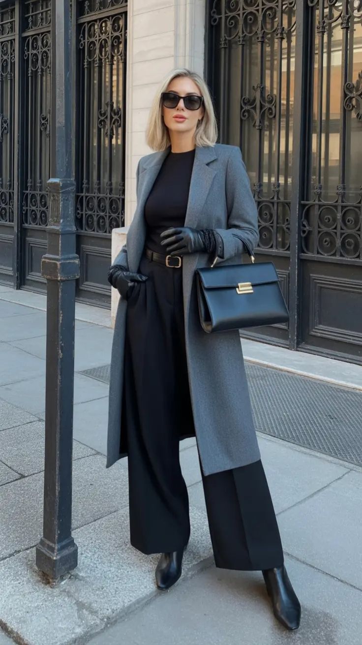 This is the quintessential Women work attire moment: clean, structured, and deeply Comfy without compromising sophistication. The long grey coat softens the severity of the all-black base, creating a balance that works beautifully in Winter or early Spring, especially for Women over 50 who prefer silhouettes that feel classic but renewed. This is the kind of look that transitions effortlessly from an Office morning to a late-afternoon Daily errand run—and remains polished the entire way.