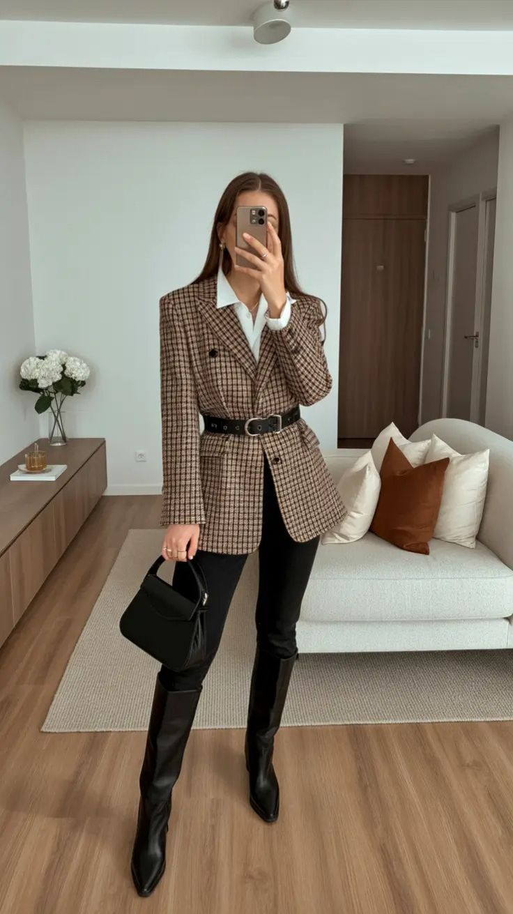 Belted Checked Blazer + Black Trousers + Knee Boots