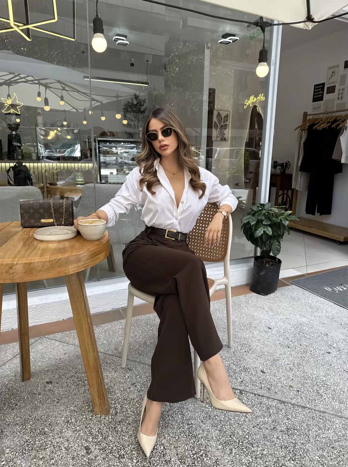 High-waisted chocolate trousers: Their heavier drape adds authority and movement—perfect for winter and autumn wardrobes.