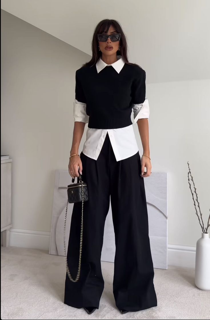 This ensemble might be one of the most Effortless transitional outfits for Autumn and Spring, blending preppy layers with relaxed tailoring. The crisp collar beneath the cropped sweater creates visual dimension, making it a great choice for Office days when you want polish without stiffness. The wide trousers add softness and movement, perfect for Daily wear or even a casual Lunch moment.