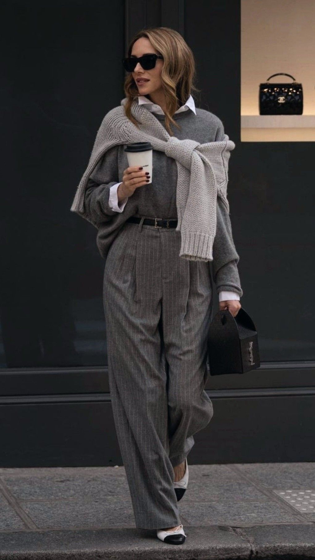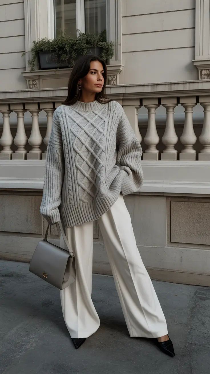 A soft grey oversized sweater paired with wide-leg white trousers delivers an ideal blend of comfort and quiet luxury — perfect for winter, autumn, and even transitional spring days. This combination is excellent for office attire women plus size, since the relaxed knit doesn’t cling and offers a naturally comfy, effortless silhouette. It works in creative offices, museum outings, or casual lunch meetups where polish meets practicality.