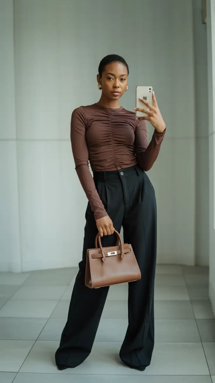 The grounded richness of a chocolate ruched top paired with relaxed black tailored trousers creates a look that feels both simple and luxuriously intentional. The long sleeves and gathered bodice soften the silhouette, making it ideal for women who want a polished yet comfy approach to work or daily errands. This combination works beautifully for straight, athletic, or hourglass figures—the vertical ruching draws the eye inward, elongating the torso—while the wide trousers offer balance and flow. It’s an especially smart choice for women at networking events who want something effortlessly striking without looking overstyled.