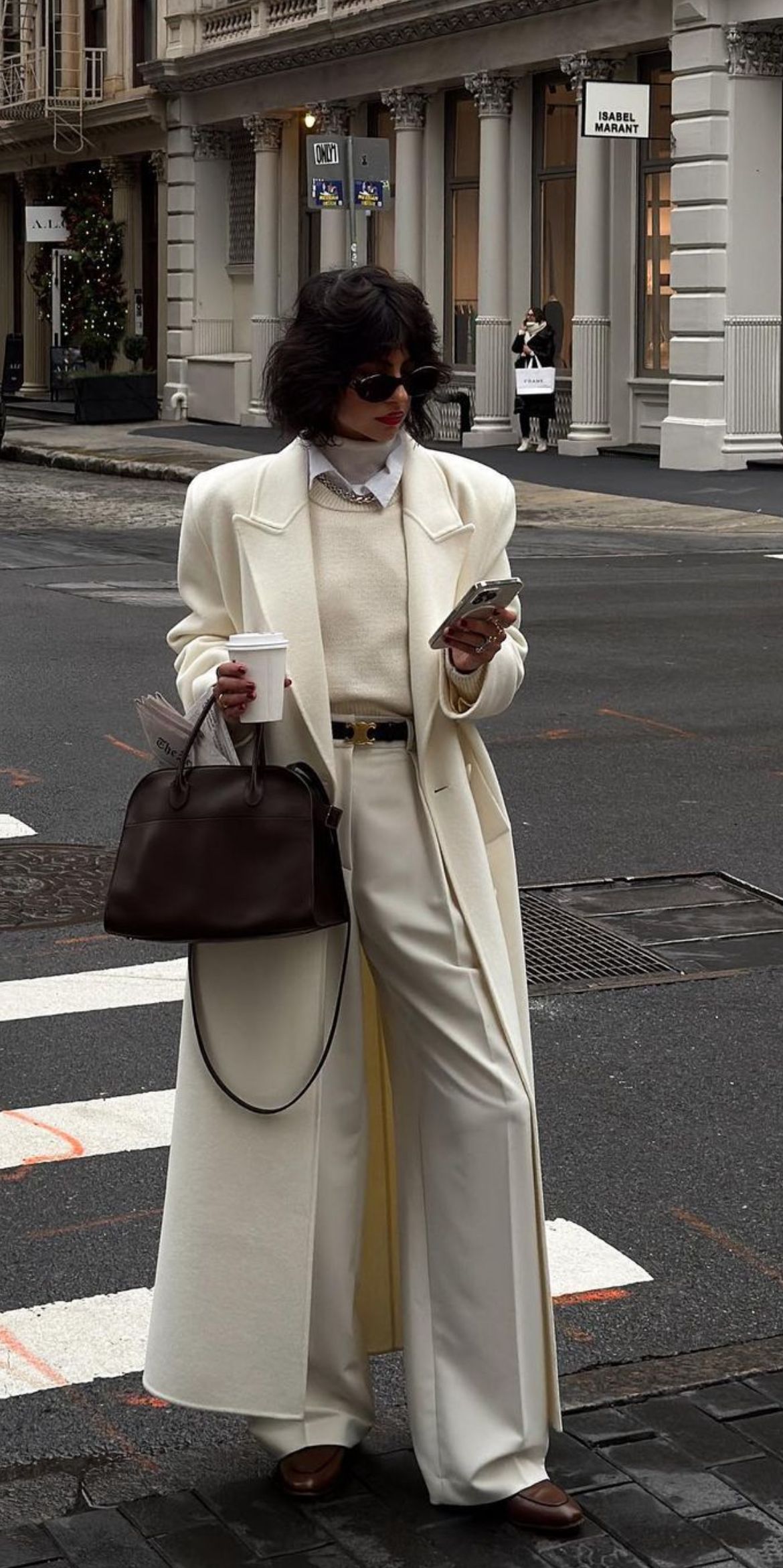 Ivory coat: Tailored, elongated, and quietly commanding; creates an instant luxury effect.