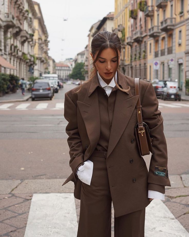 This cocoa-toned suit is the definition of chic power dressing for 2026. Strong shoulders, clean tailoring, and tonal layering make it perfect for office, networking events, or even Friendsgiving gatherings where you want to arrive polished but not overly formal. The structured silhouette flatters inverted triangle, hourglass, and rectangle figures by emphasizing shape while maintaining ease. The richness of the brown palette also works beautifully for autumn wardrobes.