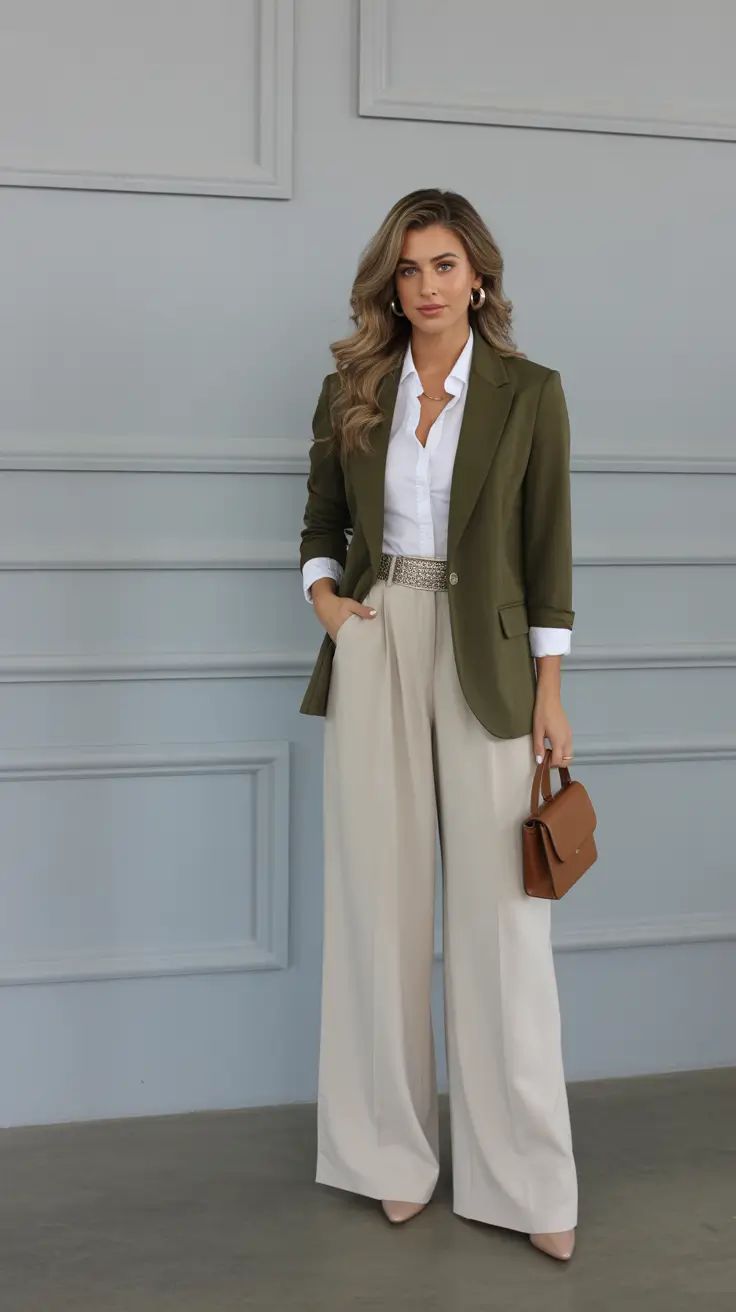 This look blends earthy tones with creamy trousers for a chic, women classy approach to office attire women plus size, petites, or mid-size wardrobes alike. The olive blazer is a refreshing alternative to traditional black or navy, ideal for spring, autumn, or mild summer office days. The tucked white shirt and pleated trousers offer sophistication without stiffness, making this look appropriate for work, university, or even a polished lunch outing with colleagues.