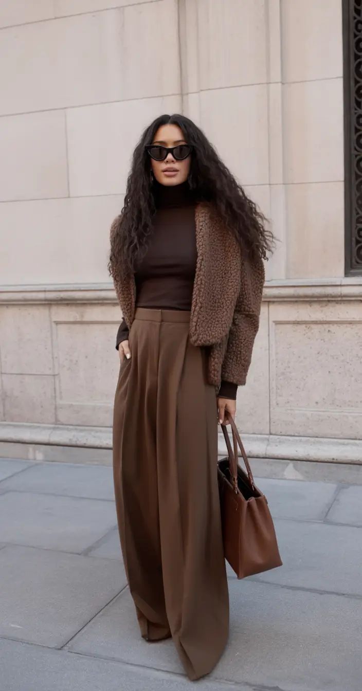 Rich chocolate tones are a standout trend for autumn and winter, balancing warmth with executive presence. This outfit — a fitted turtleneck, wide pleated trousers, and a cropped shearling jacket — suits women who want comfortable work clothes without losing structure. It’s appropriate for relaxed offices, daily city life, or even coffee breaks between meetings. The proportions especially flatter those with softer curves, since the short jacket balances the length of the trousers.
