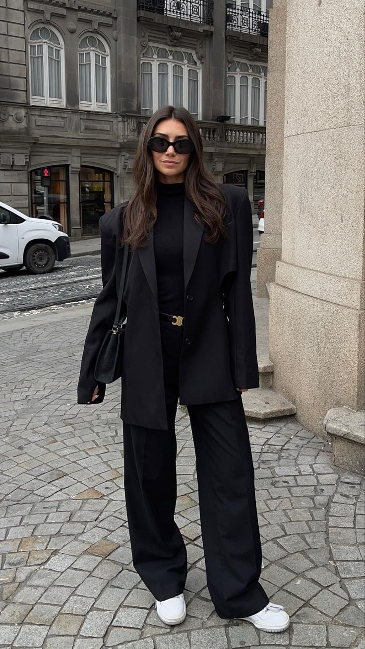 A full black monochrome look is always powerful, always women classy, and always workplace-appropriate. Oversized tailoring, wide trousers, a fitted black top, and a structured bag create a modern uniform that works for office, daily, movie nights after work, and women at networking events. This silhouette flatters nearly all body types because it elongates and streamlines.