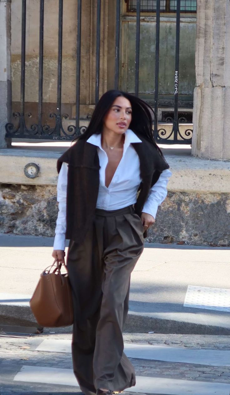 This combination — crisp white shirt, sweater tossed over the shoulders, and wide earthy trousers — feels intellectual, warm, and versatile. Perfect for the office, university, daytime lunch, or relaxed meetings. Suitable for women across age groups and stylistic preferences, especially those who enjoy simple, grounded tones.