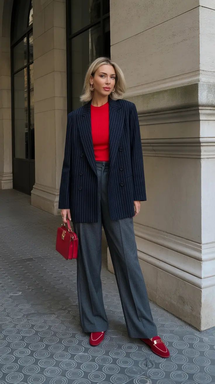 A navy pinstripe blazer paired with vivid red accents creates a dynamic, high-impact business casual look. Ideal for women at networking events, holiday-season Christmas gatherings, daily office life, and even workdays where confidence is key. This palette works well for women who want classic tailoring with a fun burst of color.