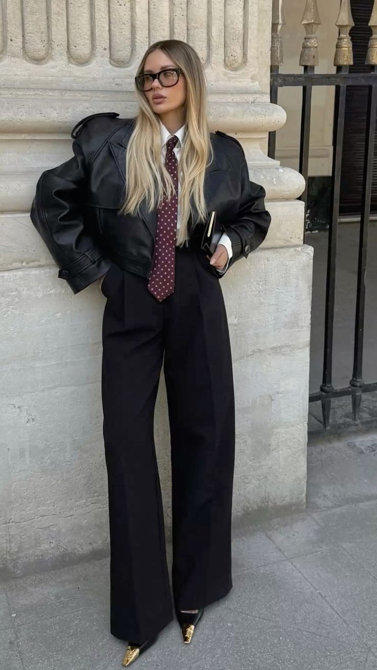 This look plays with masculine tailoring in a way that reads intentionally sharp yet surprisingly Effortless. The cropped leather jacket balances out the elongated wide-leg trousers, creating a dramatic but wearable silhouette that elongates the legs—especially great for Women who enjoy height-boosting proportions. The structured white shirt and burgundy tie add a playful, slightly academic twist that feels right for a University setting, a laid-back Work day, or even a chic Museum afternoon. It’s a strong option for transitional Autumn dressing, where layers help you navigate shifting temperatures without sacrificing style.