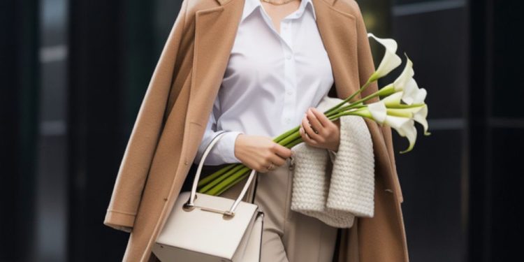 This layered neutral combination is a masterclass in effortless elegance. A crisp white shirt, camel coat, and knit casually draped over the shoulders create a polished but soft aesthetic, ideal for spring, cooler summer mornings, autumn, and refined winter styling. It’s great for women over 50, university instructors, and professionals who value subtlety and practicality.