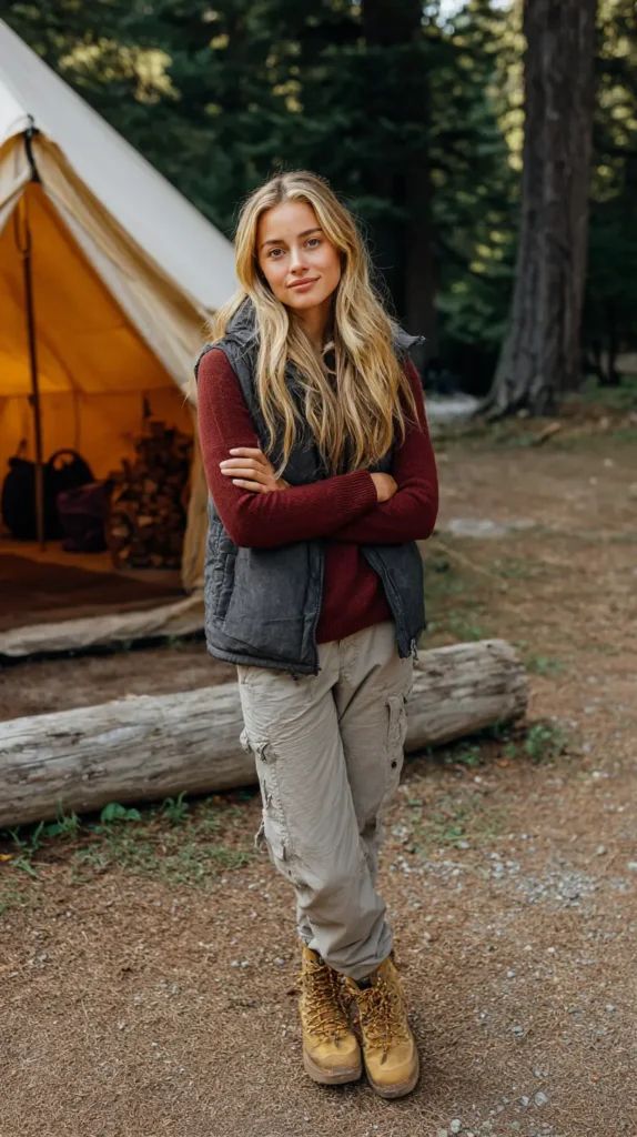 The warm-toned layering in this look is exactly what makes a camping wardrobe feel so timeless. A maroon knit sweater paired with a charcoal puffer vest creates insulation without bulk, ideal for early Spring, chilly mornings, or Cold mountain air. The beige cargo pants keep the outfit firmly rooted in Outdoor practicality, while the sturdy hiking boots ground the look in comfort and durability. This style works beautifully for most body types because the straight-leg pants and fitted knit top balance proportions naturally. It’s perfect for forest trails, cabin time, or light Women summer hiking aesthetic trips — but not ideal for extremely hot Summer days.