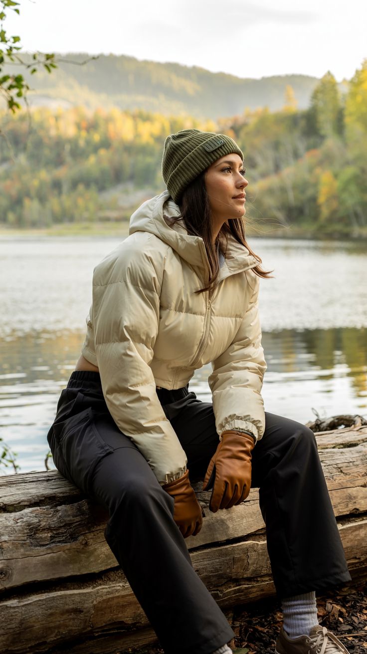 This ensemble leans into practical winter dressing with a subtle feminine twist. The cream puffer jacket is cropped just enough to maintain shape without losing warmth, while the olive ribbed beanie creates that grounded outdoor balance. The warm caramel gloves give a soft 80s summer nostalgia through their tone, though the outfit is fully designed for cold seasons. Perfect for forested lake trips, chilly desert mornings, and easy-to-moderate hikes. Especially flattering for petite figures since the cropped silhouette elongates the legs.