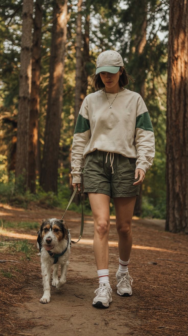 A warm-weather summer hiking moment that blends relaxed comfort with a faint Christian modesty through covered shoulders and mid-length sleeves. The cream-and-forest-green sweatshirt paired with olive shorts creates that soft, earthy palette so common in women summer hiking aesthetic trends. It’s perfect for easy forest trails, morning dog walks, or casual beach-adjacent campsites. Works beautifully for rectangle or athletic shapes, enhancing curves with subtle contrasts.
