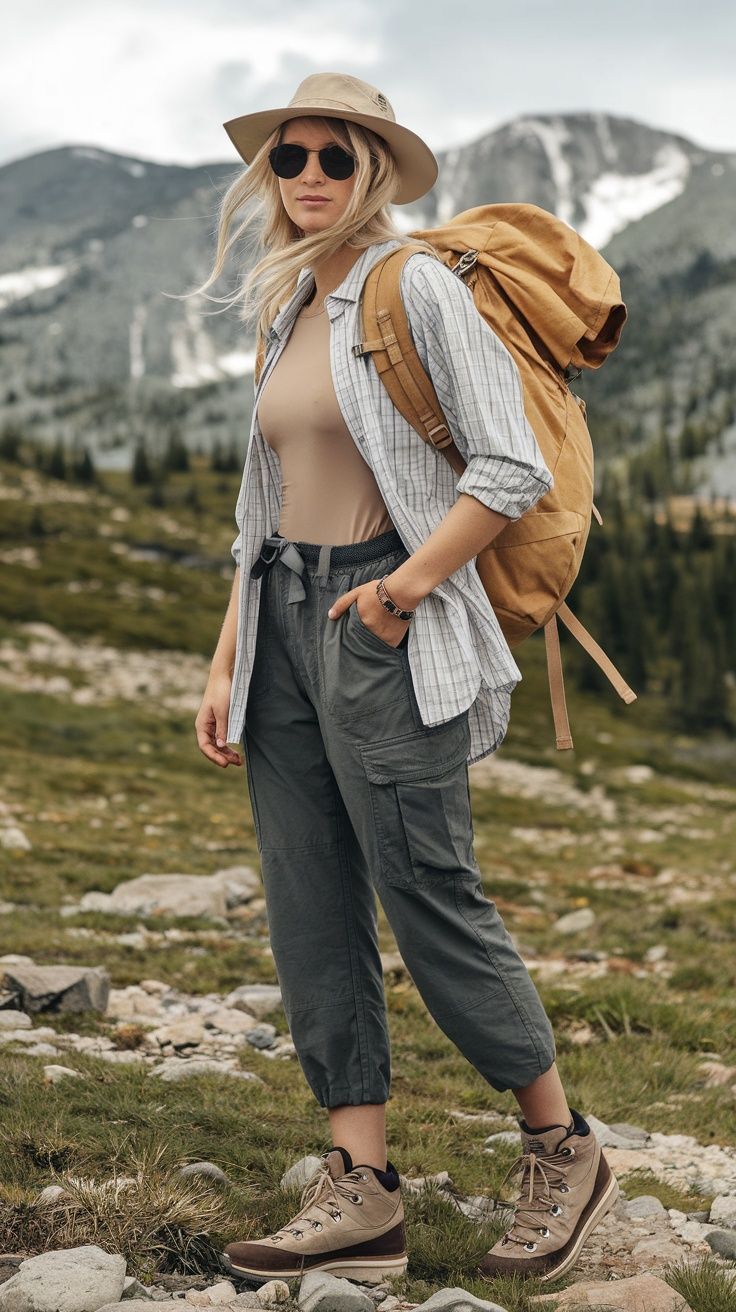 This look embodies the modern adventurer—clean lines, neutral tones, and a subtle nod to classic summer-meets-spring wilderness style. The tucked tank and open striped shirt create breezy airflow for desert treks and warm outdoor days. The cropped cargo pants maintain mobility while the wide-brim hat protects against harsh sunlight. Best for warm climates and universally flattering thanks to its adjustable layers.