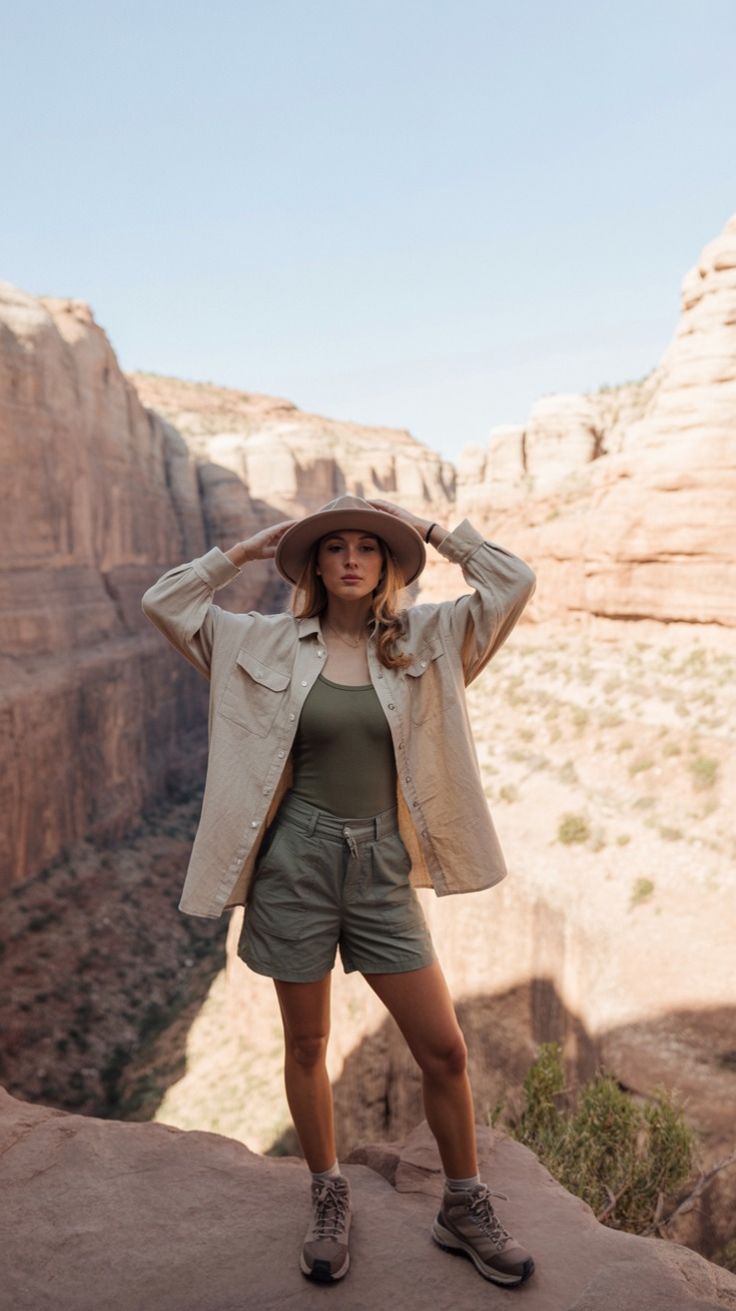 An ultra-clean neutral palette suited for desert canyons, warm summer hikes, and adventurous travel days. The oversized sand-colored shirt creates a cool layer over the olive tank and shorts, offering coverage from sun exposure while enhancing breathability. Works beautifully for tall or long-torsoed figures because of the elongated silhouette. Less suitable for damp winter conditions.