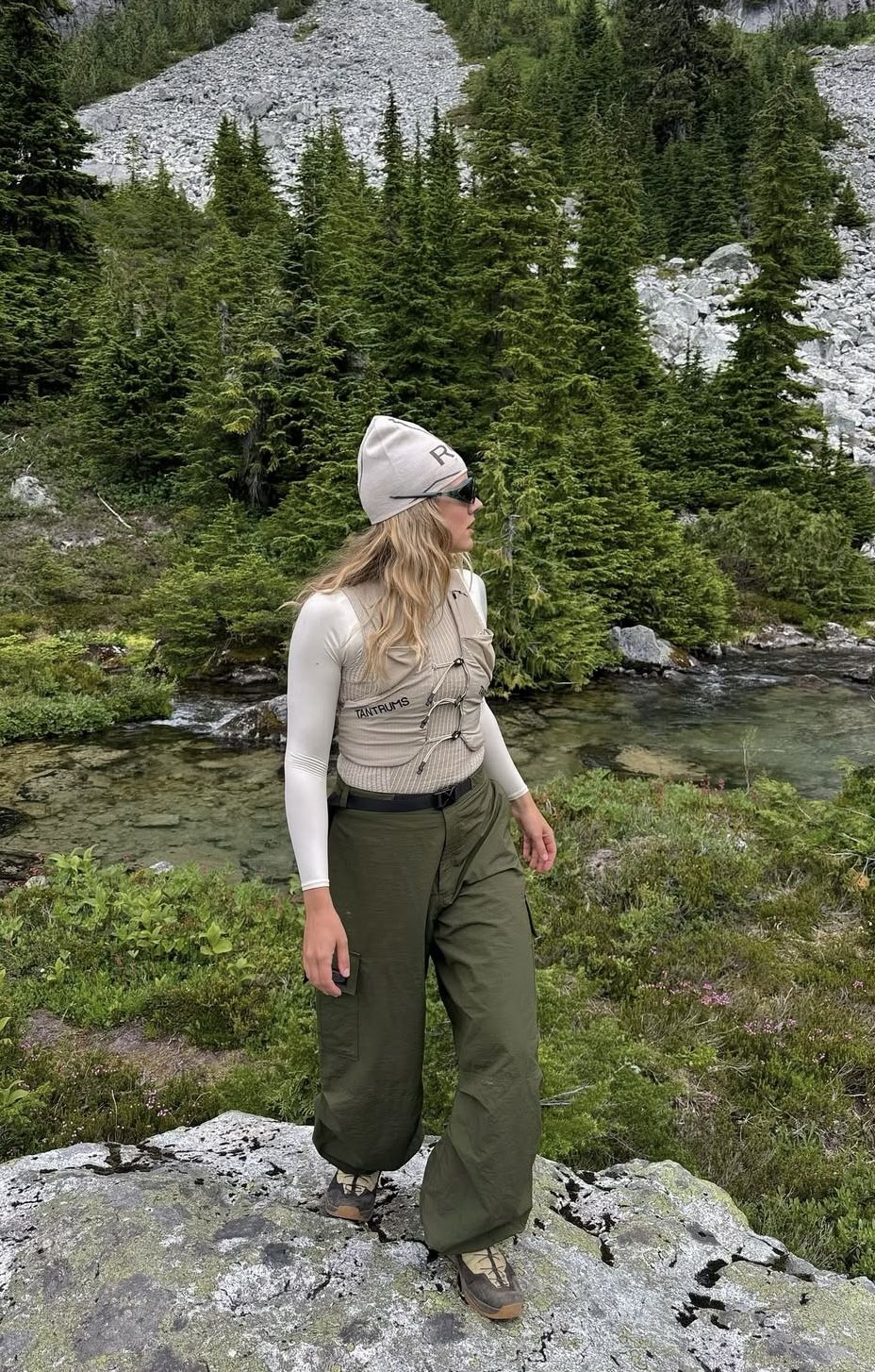 A futuristic, technical outdoor look with a performance-driven twist. The cream and olive palette feels modern and slightly edgy, tapping into sporty women summer trends even though the outfit is tailored to cooler climates. The slim base layer contrasts with the voluminous pants, flattering hourglass, pear, and rectangle figures. Great for rugged terrain, alpine day trips, and high-energy camping adventures.