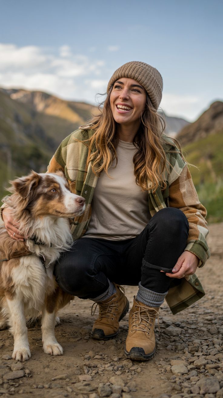 Here we get that dreamy Women-focused outdoorsy warmth — soft plaid flannel, neutral beanie, classic tee, and rugged boots. It’s comfortable, approachable, and great for unpredictable Spring and Fall temperatures. This outfit is perfect for dog-friendly camp days, lake walks, or relaxed campground hangs. The flannel’s loose structure makes it flattering on many body shapes, especially for those who prefer a little extra upper-body ease. It’s not ideal for extremely Hot Summer weather, but perfect for cool-weather outings.