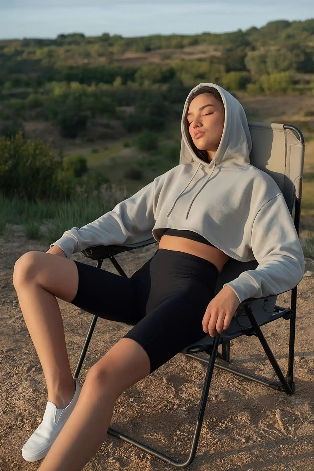 This outfit captures the relaxed, minimalist side of summer camping—ideal for lounging at sunset after a long active day. The cropped hoodie and high-rise biker shorts create a clean silhouette that emphasizes comfort and ease, perfect for warm beach-adjacent camps, casual gatherings, or moments of quiet retreat. Great for hourglass and athletic shapes because of the balanced proportions.