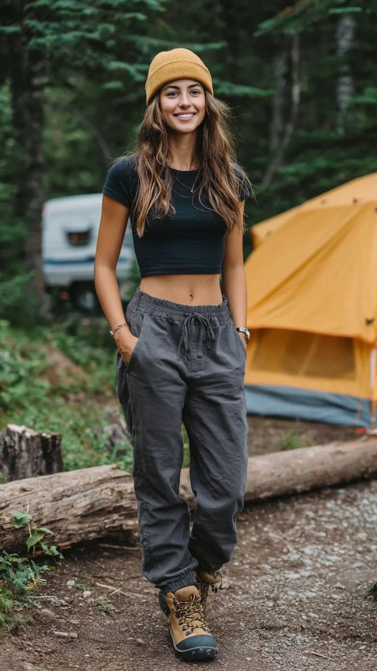 This look leans into Women summer minimalism — breathable, comfortable, and cute without trying too hard. The cropped charcoal tee gives the outfit a youthful Aesthetic, while the relaxed drawstring pants keep it grounded for campground activity. It’s ideal for Summer, beachside camping, or desert trips where airflow matters. It works especially well for petite and athletic frames, though those who prefer mid-rise coverage could swap the crop top for a fitted tank.