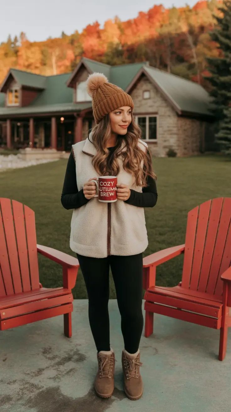 A perfect example of Winter or late-Fall cabin dressing — sherpa vest, black knit, leggings, and warm boots. It’s an incredibly flattering setup because the slim lower silhouette balances the fluffy upper layers. This look is amazing for Cold mornings, fireside cocoa moments, or even Christian camp retreats thanks to its modest, warm, family-friendly charm. It’s not suitable for hot-weather camping, of course, but it’s unbeatable when temperatures drop.