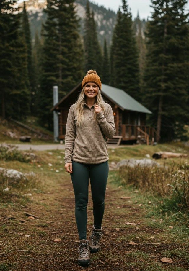 Here we get simplicity at its finest — a taupe thermal top, deep-green leggings, hiking boots, and a mustard beanie. This look is perfect for Spring, early Summer, and high-altitude trails where temperatures swing. The fitted silhouette is best for active days, making it suitable for most body types except those who prefer looser layers for movement. It’s great for forest trails and casual hiking but not ideal for desert heat.