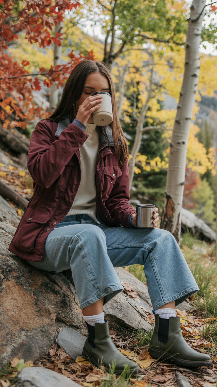 This is the most relaxed, artsy Aesthetic of the lineup — wide-leg denim, chunky boots, a burgundy field jacket, and a cream sweater. This look suits Church retreats, School trips, and calm outdoor mornings where comfort matters most. It flatters many figures thanks to its structured top and flowing trousers. It’s ideal for Fall and mild Winter, but denim isn’t great for wet terrains or heavy hiking.