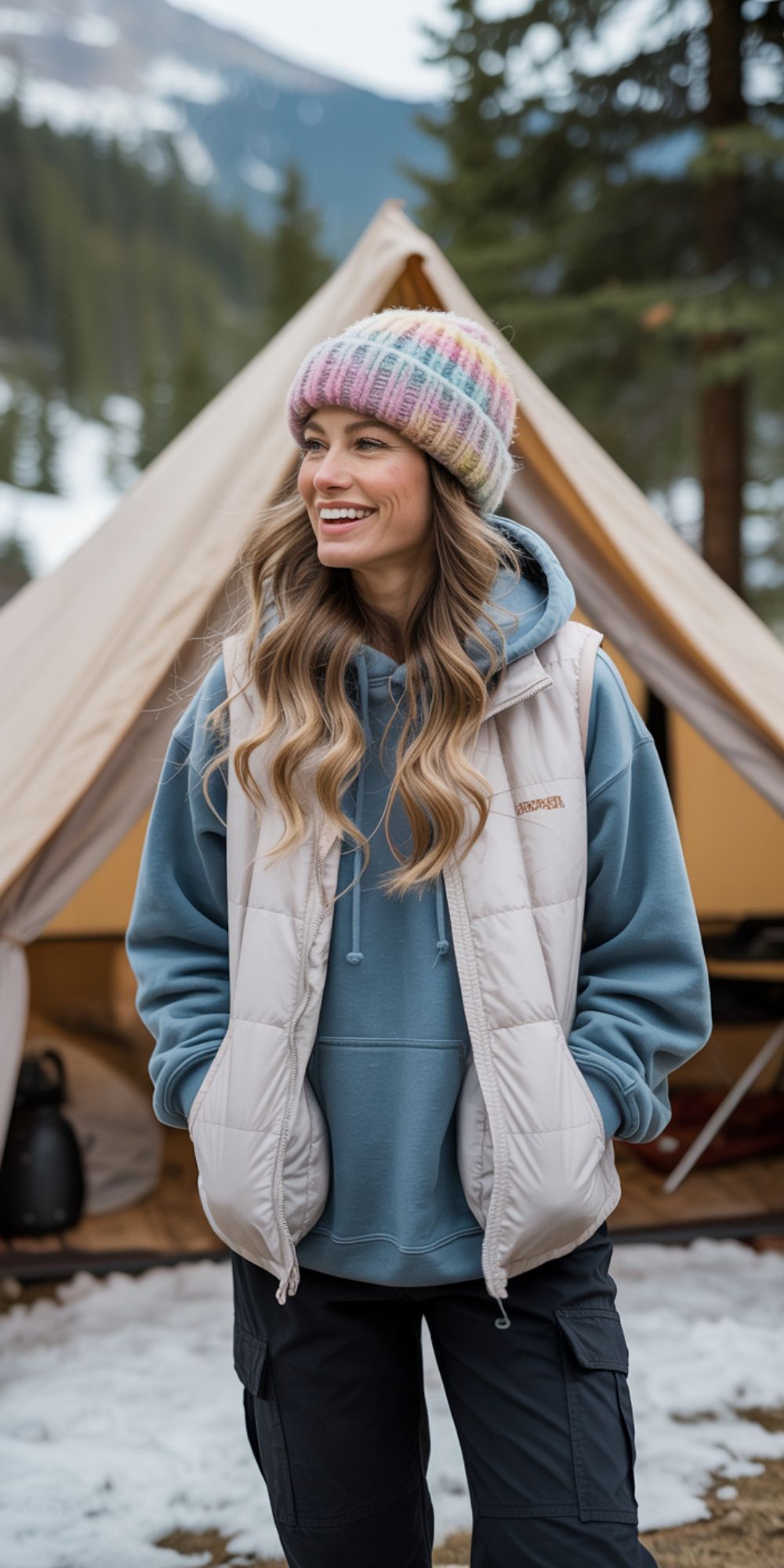 This is a creamy, warmly layered winter camp outfit with a touch of soft femininity. The beige sweatshirt underneath the ivory puffer vest creates a monochromatic palette that feels curated and quietly luxurious. The green knit beanie adds a playful cute charm. Ideal for spring-to-winter transitional days or chilly high-altitude camping. Works well for apple and hourglass figures as the vest subtly shapes the waist.